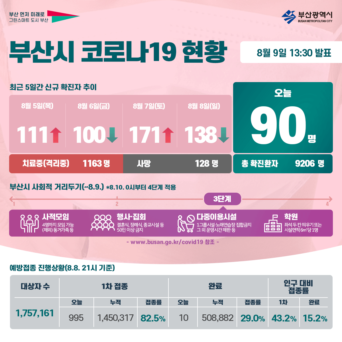 '4단계 격상' 고심하던 부산, 현행 3단계 2주간 유지 결정(종합2보) 부산시 현재 발생 인원 3단계 해당…선제적 대응 중 백신접종자 인센티브 중단…8월1일까지 유흥시설 등 영업제한도 네, 부산은 거리두기 4단계 기준인 하루 확진자 137명에 근접한 상황인데요. 4단계 격상 조치에 따라 사적 모임은 18시 이전에는 4인, 오후 6시 이후부터는 2인까지. 부산 4단계 격상…확진자 급증, 의료시스템 붕괴 위기(종합2보). 이소라 / 부산시 시민방역추진단장 :
